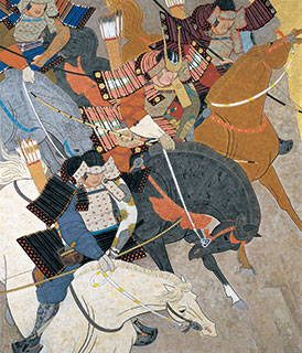 羽石光志(1903-1988)は本県茂木町生まれの日本画家。小堀鞆音、安田靫彦に師事し、師の画風を継ぎながら、厳密な歴史研究に基づく歴史画を描いた。日本美術院で活躍し、昭和30(1955)年に同人に推挙された。法隆寺金堂の壁画模写や、日光東照宮の陽明門天井の「双龍図」の復元をするなど文化財保存においても功績を残している。昭和の終わりまで近代歴史画家として制作を続けた。