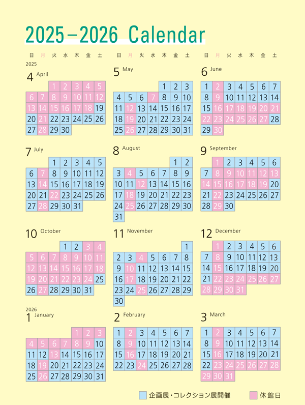 休館日 | 月曜日(祝日、振替休日、県民の日は開館して翌日休館)、展示替期間、年末年始 |