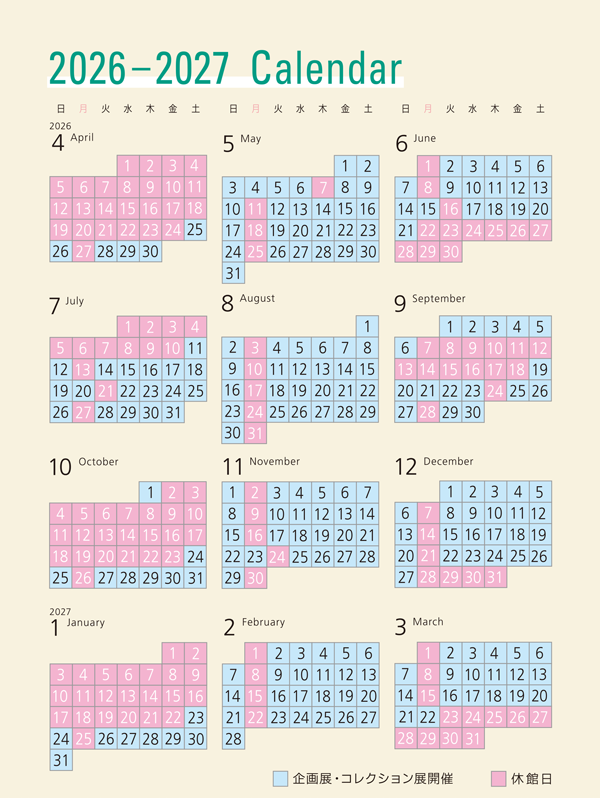 | 休館日 | 月曜日(祝日、振替休日、県民の日は開館して翌日休館)、展示替期間、年末年始 |